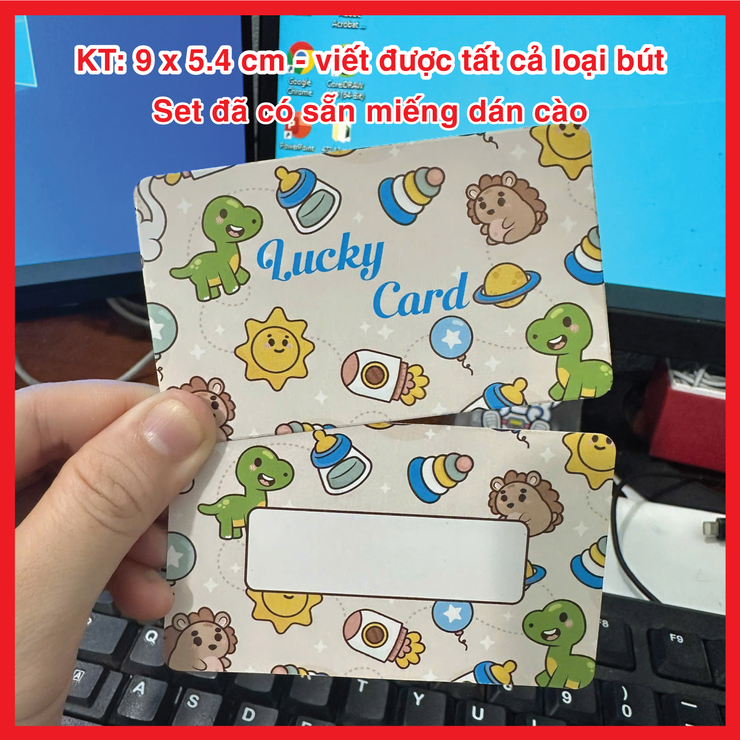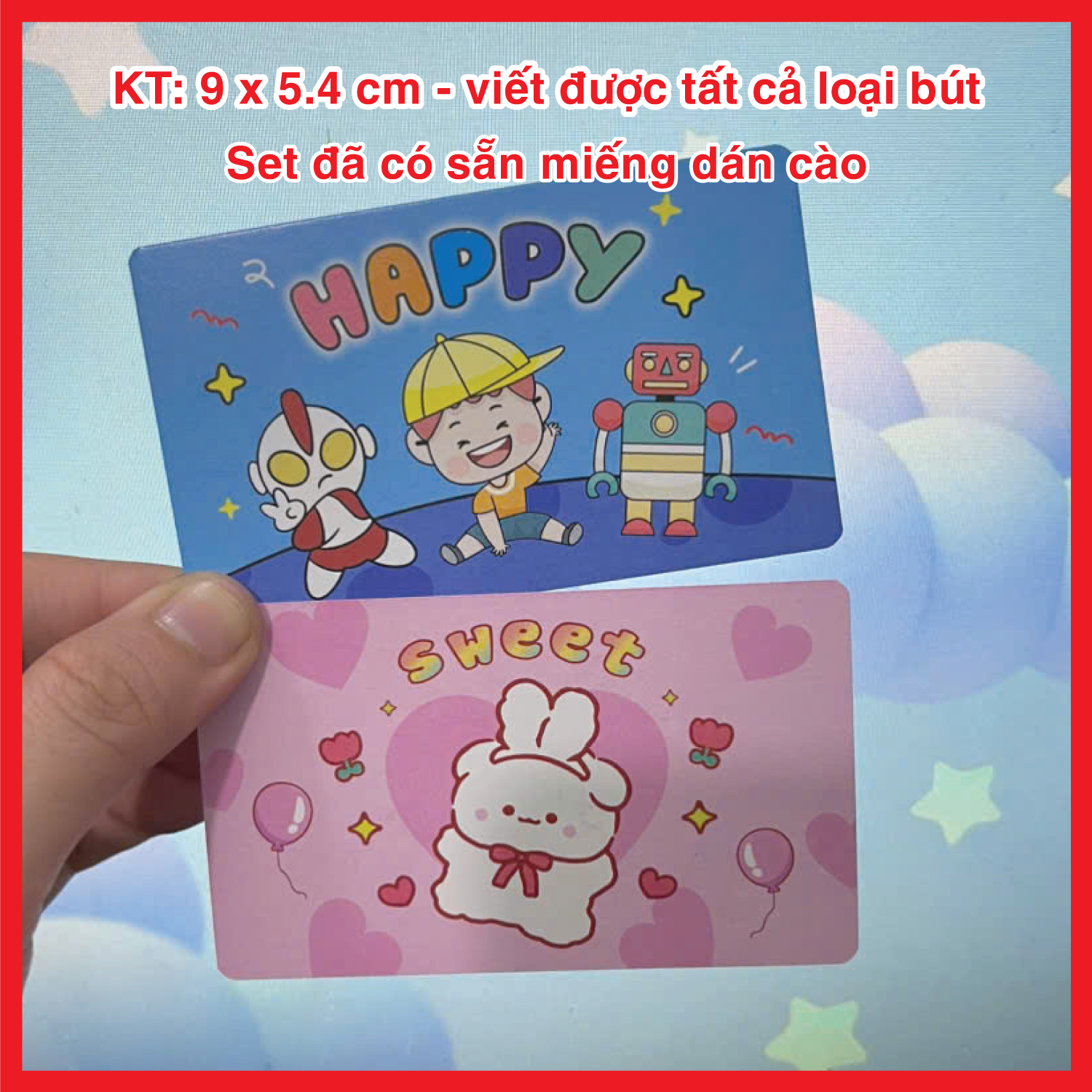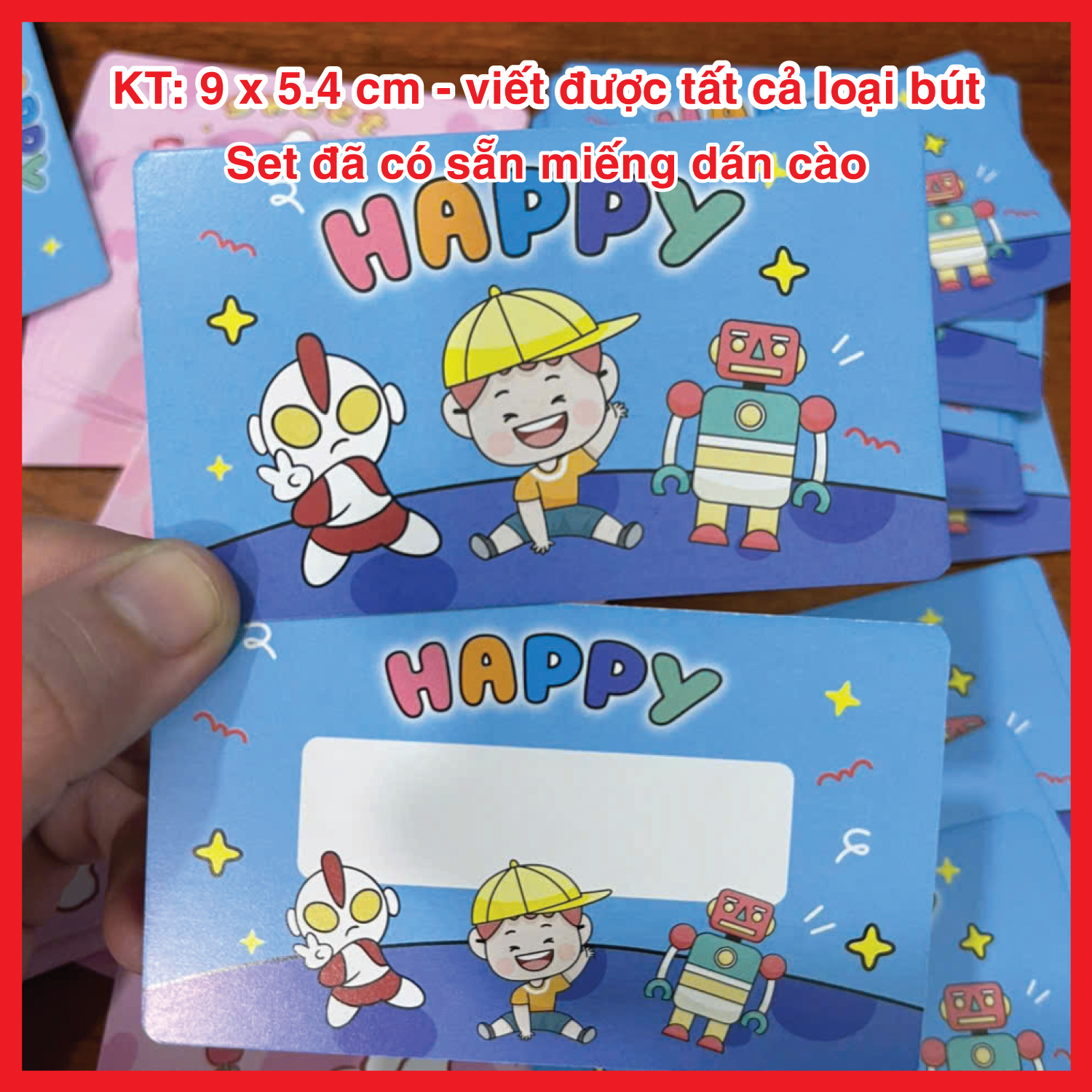 – Set thẻ đã có sẵn miếng dán cào, viết được tất cả các loại bút